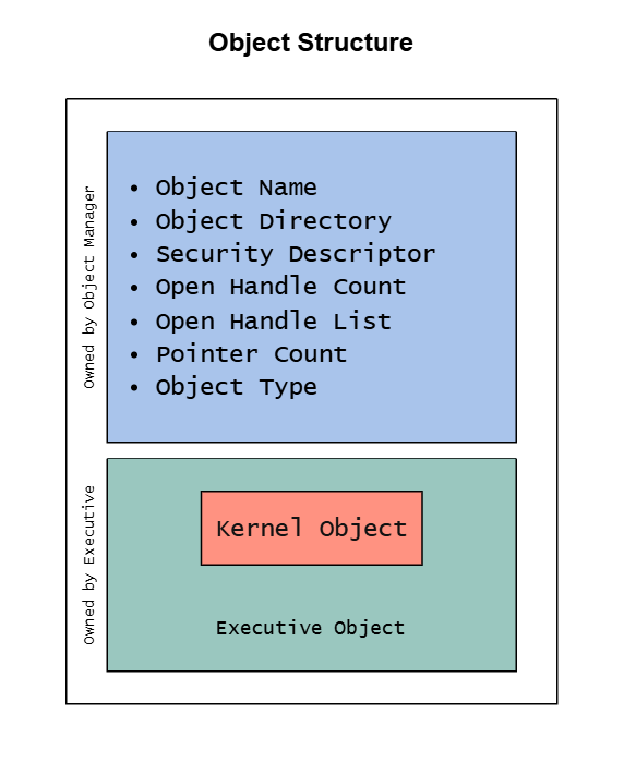 In Windows, objects are managed by Object Manager that’s part of the Executive component in the kernel space as described earlier. Part of the object structure is owned by the Executive and it’s called Kernel Object. Some Windows APIs exposes object types such as: