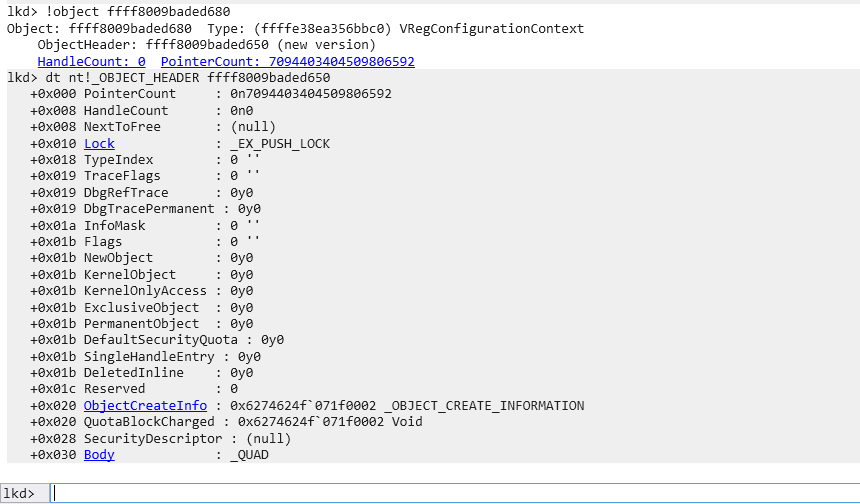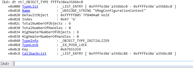 We can also see the object type itself named VRegConfigurationContext which has the following address ffffe38ea356bbc0. And as we can see there’re only 6 objects of this type in the whole system.
