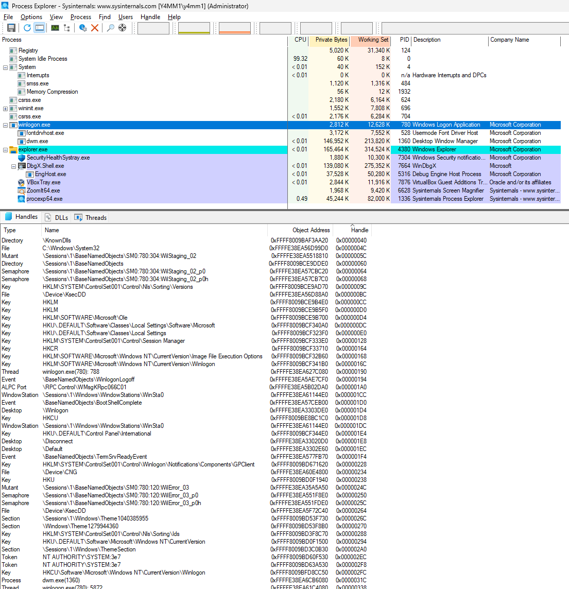 As we can see, the highlighted process winlogon.exe has several handles and each handle gets a pointer as seen in the last column as well as the Object Address which represents the actual address in the kernel space in addition to its type name.