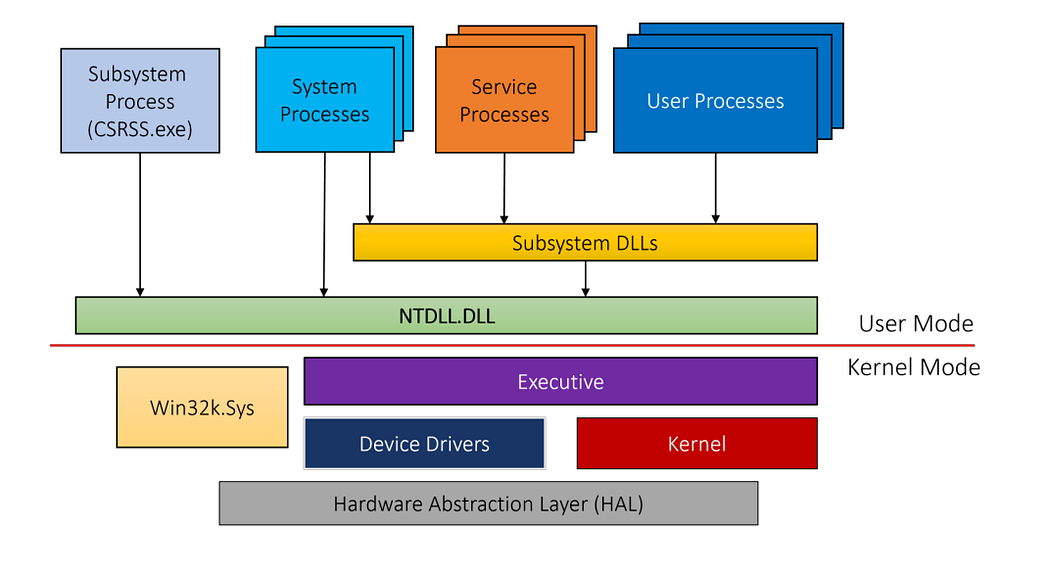 As you can see, the red line in the diagram below separates user mode from kernel mode components. Some of the applications you see in Windows run in user mode which has user power privileges and others, that are hidden, run in kernel mode which has kernel privileges that’s also have the full power.