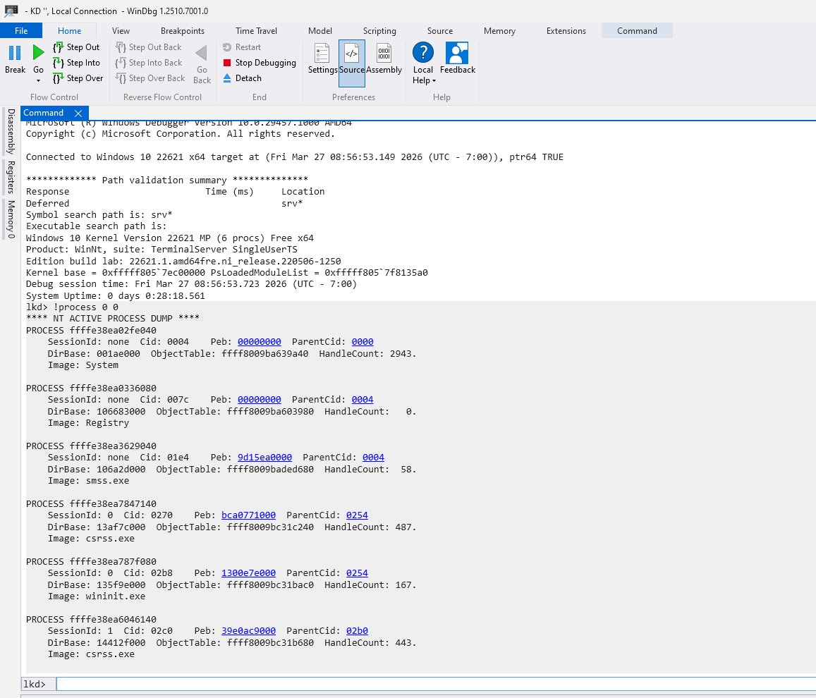 You can use this command !process 0 0 in order to enumerate all the running processes. Let’s have a look into smss.exe process which at the address ffff8009baded680. We can see the object header address by typing this !object ffff8009baded680 command.