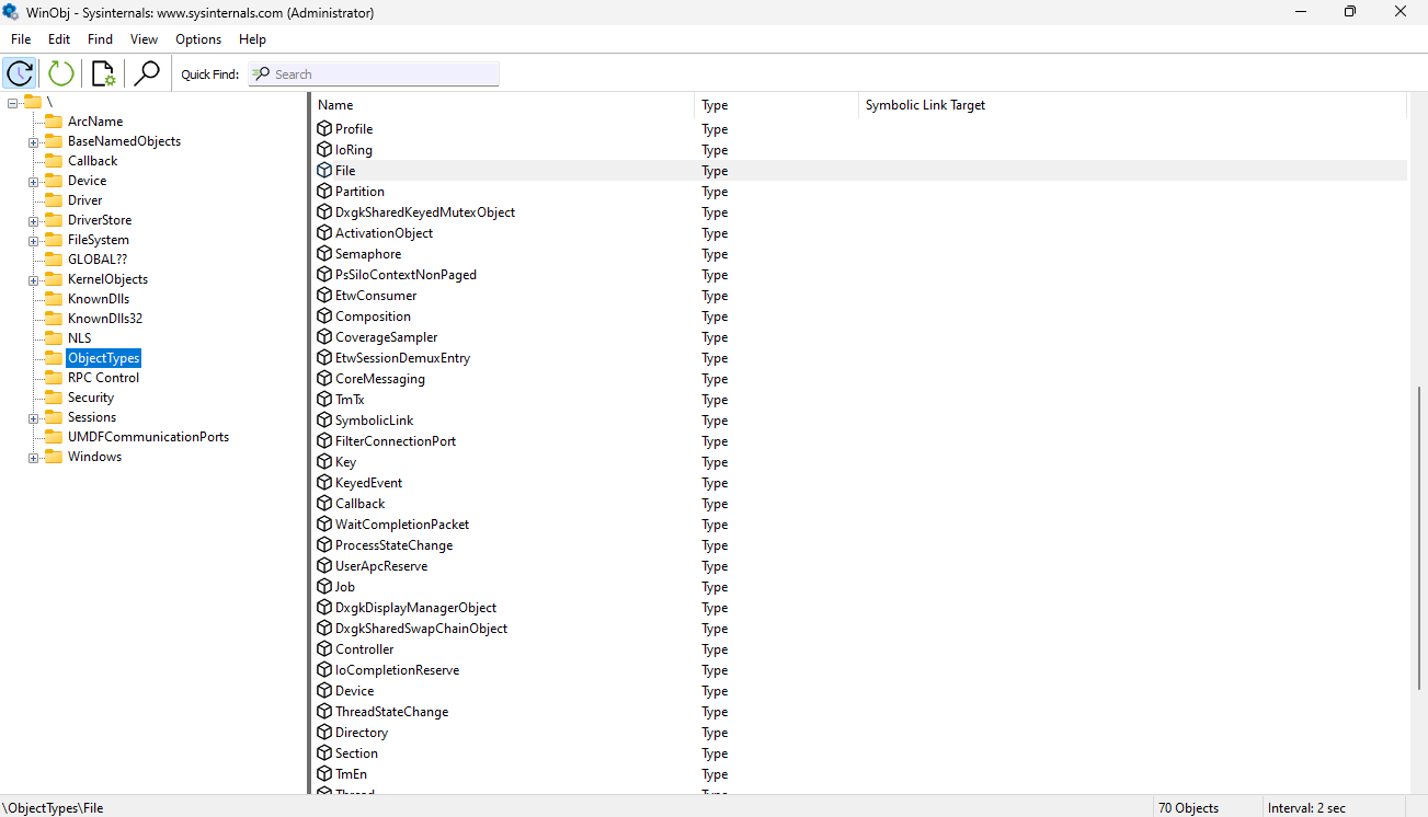 As we explored above what’s an object and how it relates to Windows kernel. Another additional feature that the object manager provides is something called session. Sessions can be related to each logged in user on the system and each session should have its own objects. All the objects created under specific session can be found in BaseNamedObjects folder and that folder is under another folder named by the session number \Sessions\<session number>\BaseNamedObjects.
